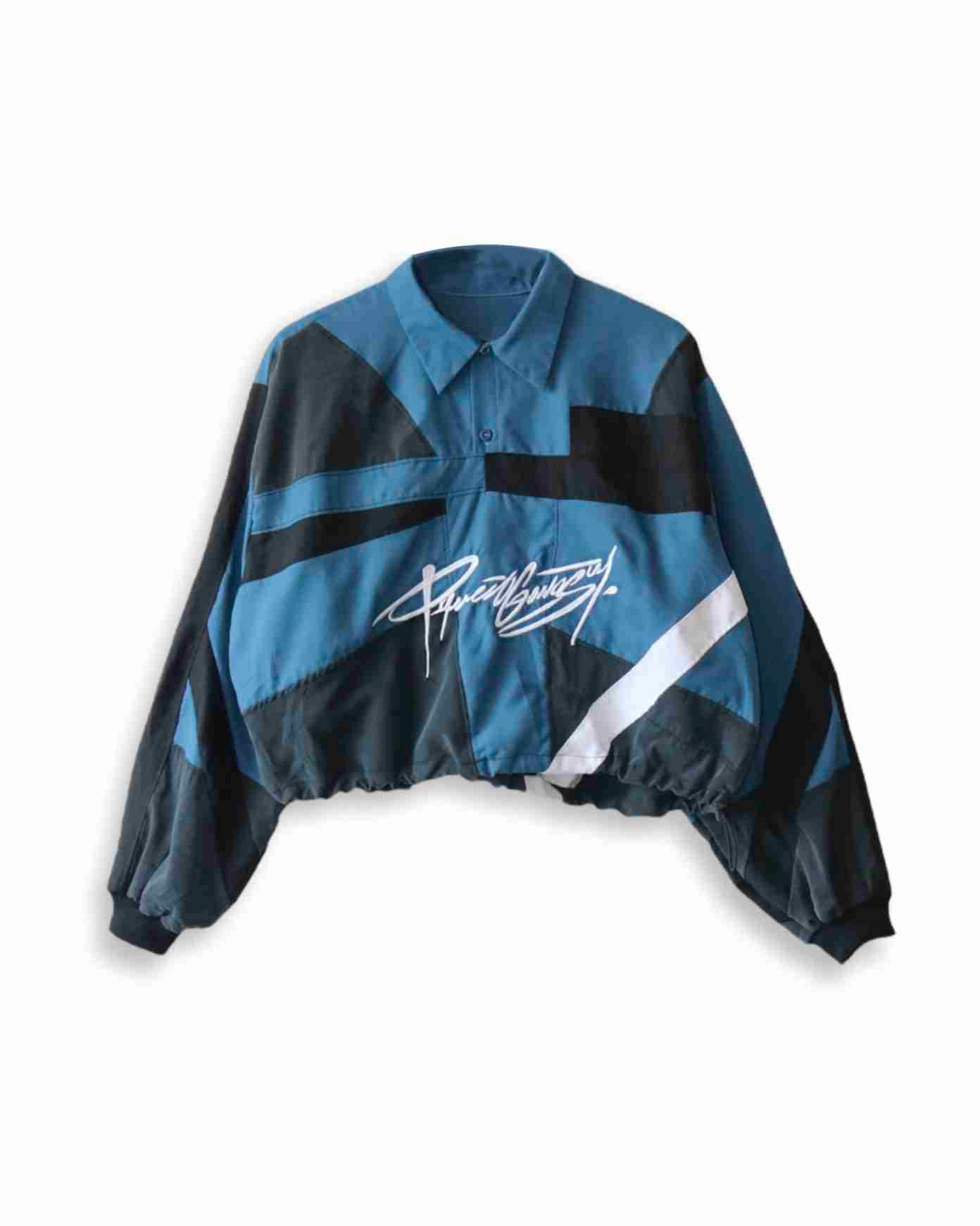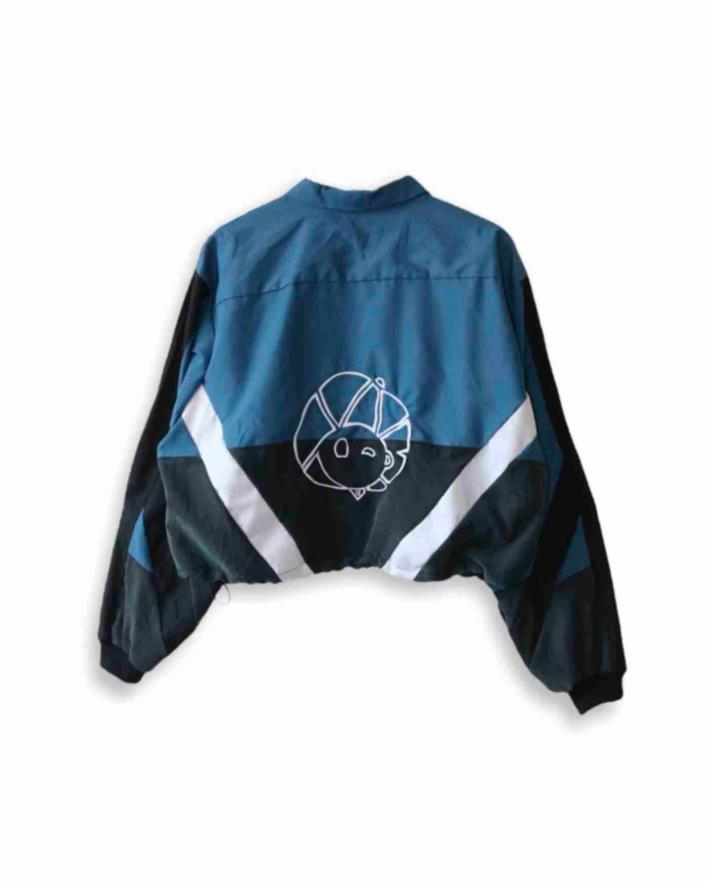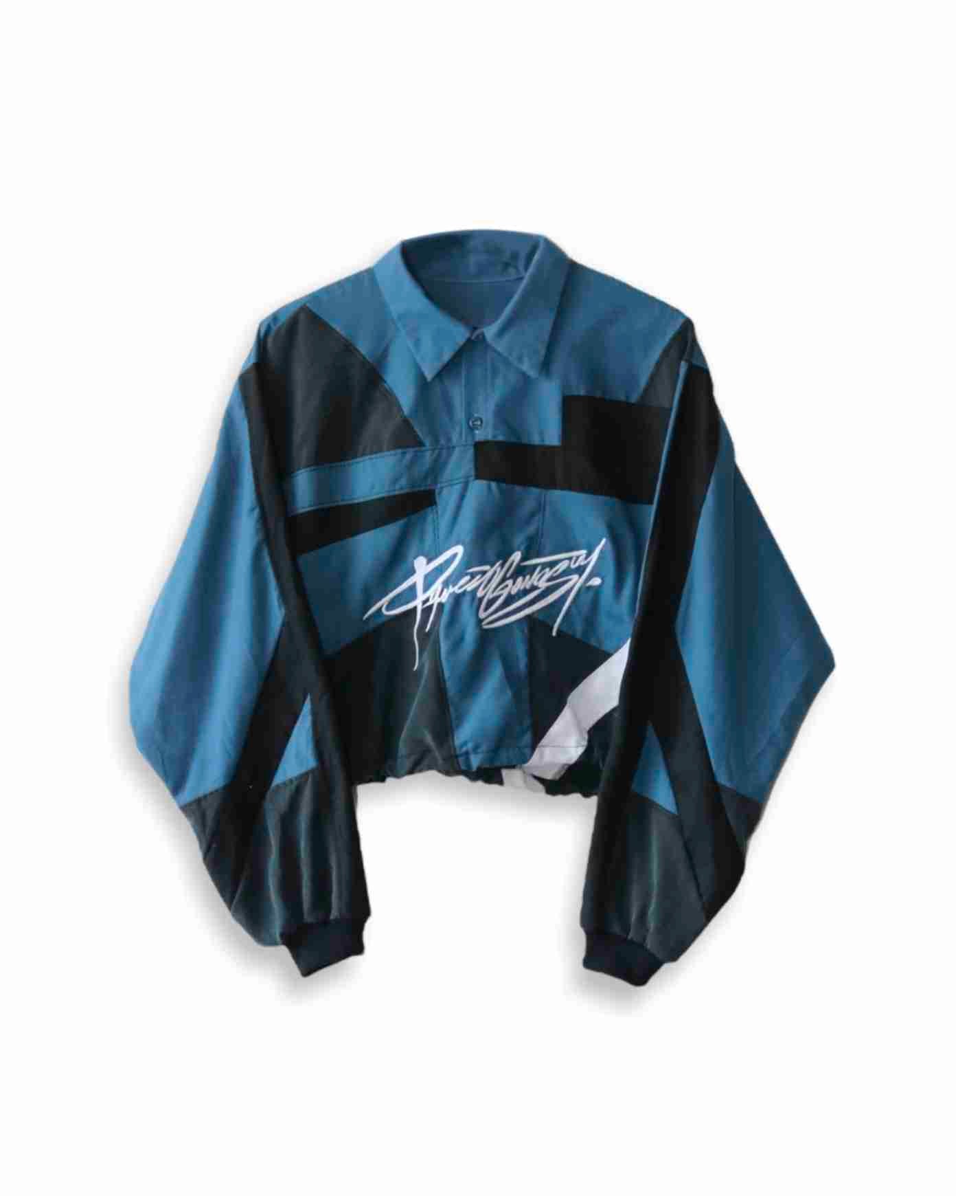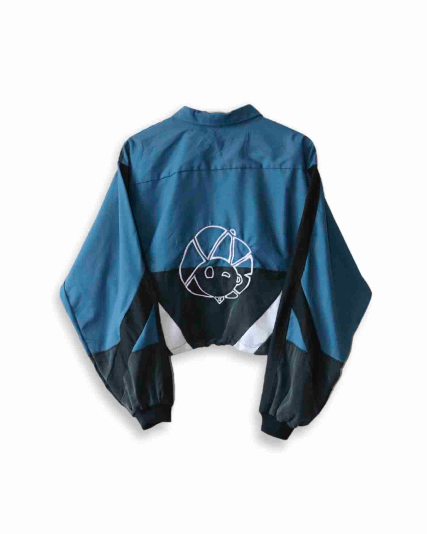 Prenda creada con retazos de camisas de franela delgada, bordado color blanco en la espalda y frontal. Tiene elástico ajustable en la pretina y puños de polerón