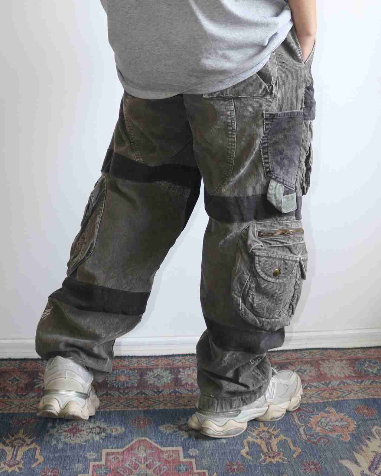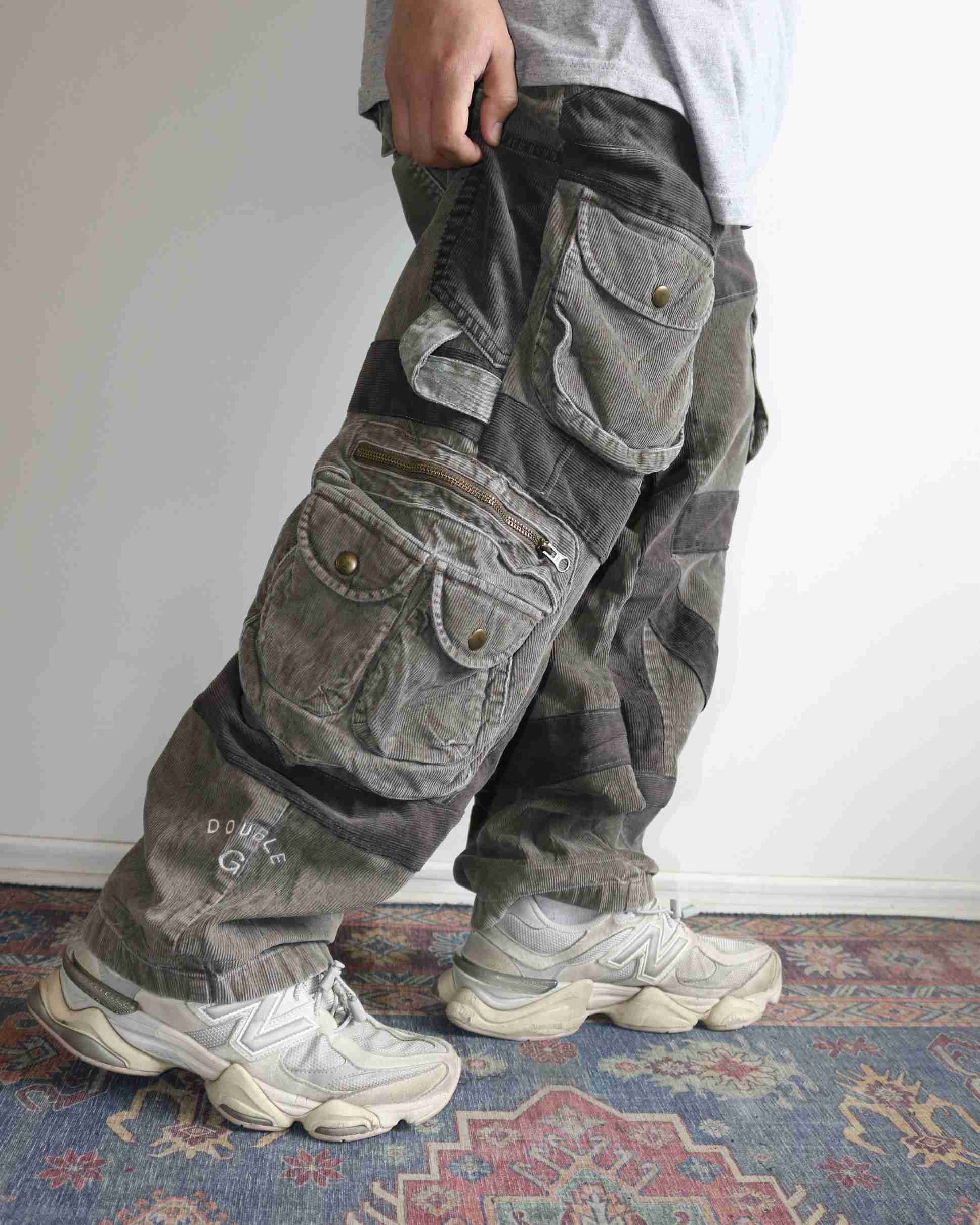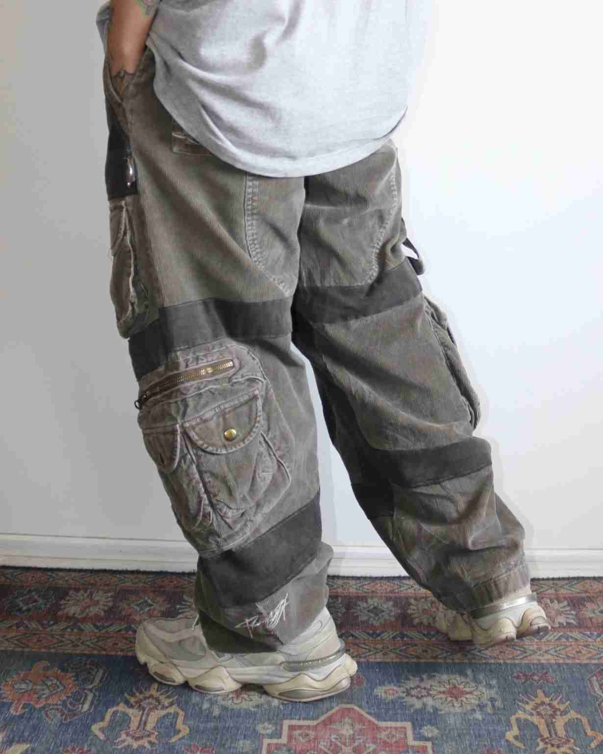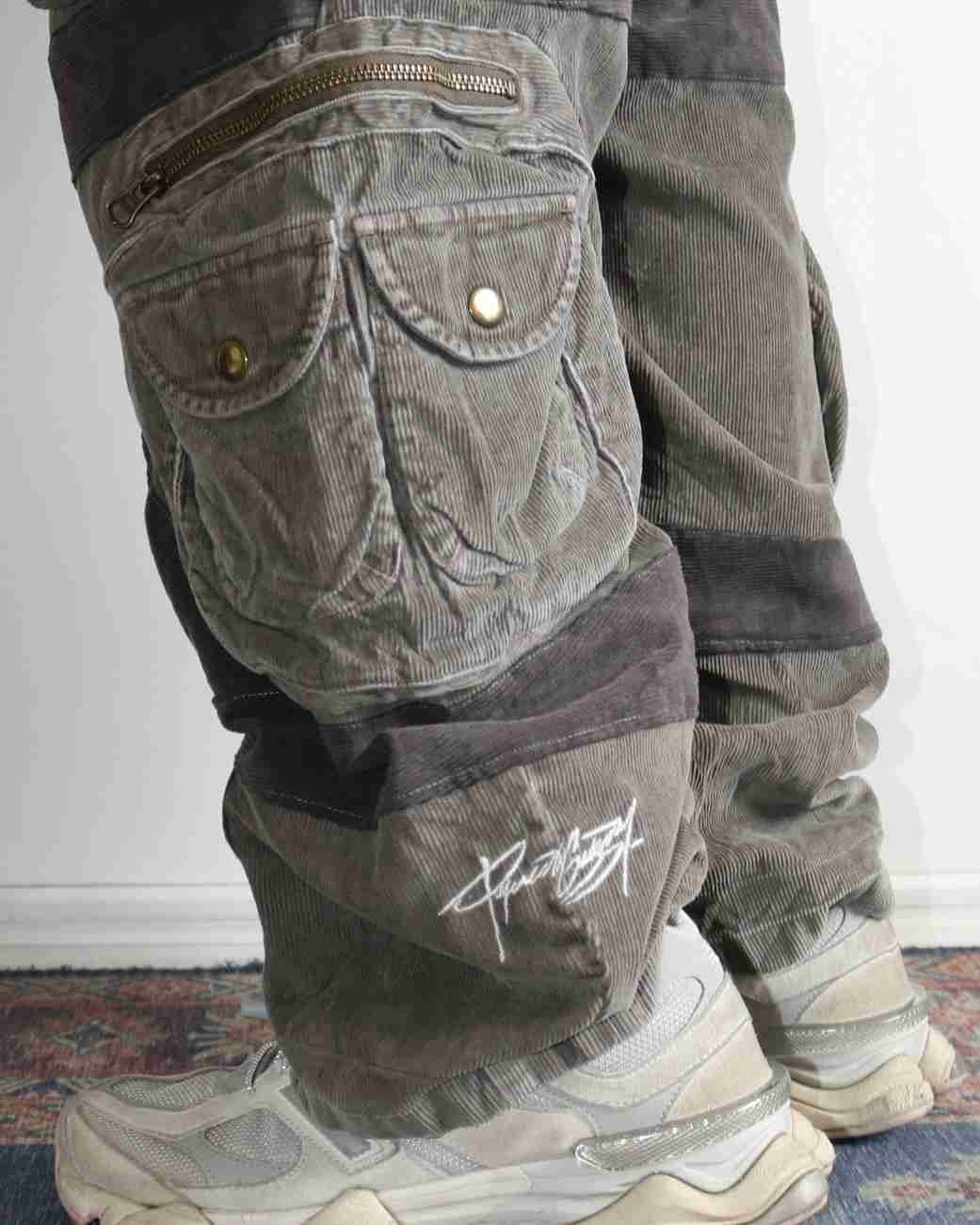 Prenda creada en base a pantalón reciclado y retazos de chaqueta cotele y detalles de camisa gruesa. Cuatro bolsillos en cada pierna a la altura de la rodilla, uno de ello posee cierre - tres bolsillos en la parte trasera - broche lateral porta llave en la pierna izquierda - bordado de color beige en cada pierna - En total posee 13 bolsillos.