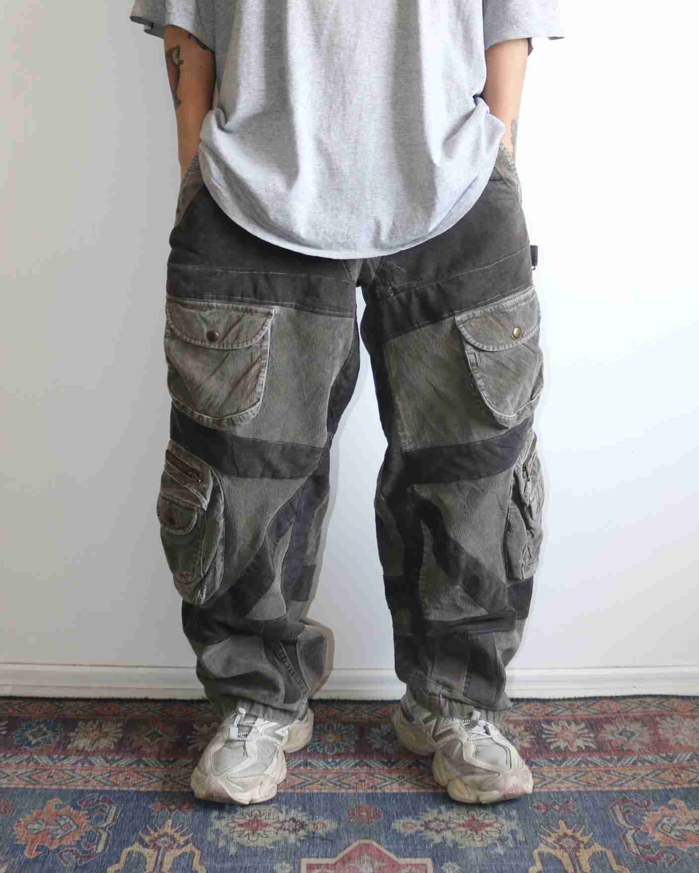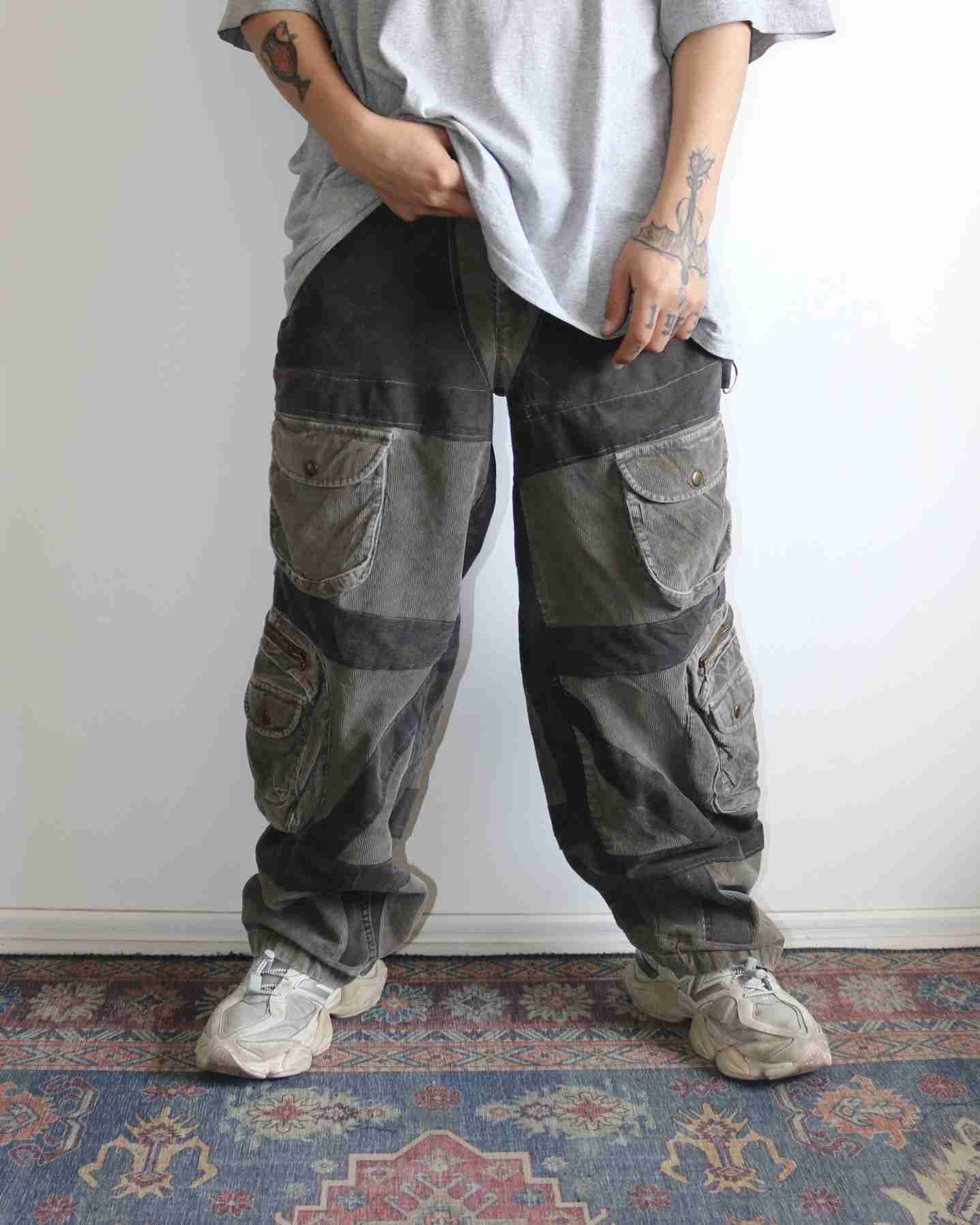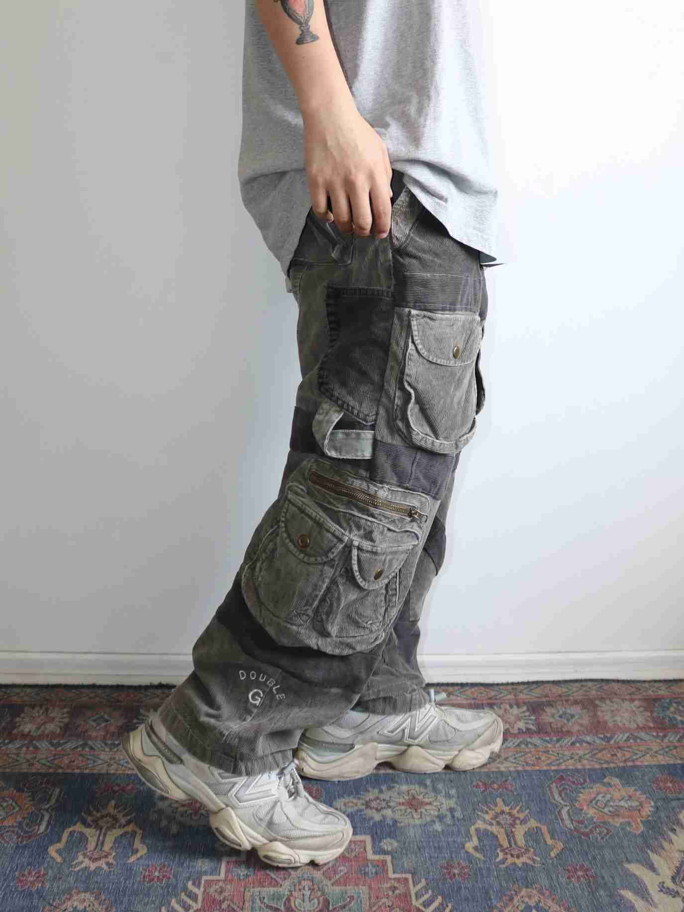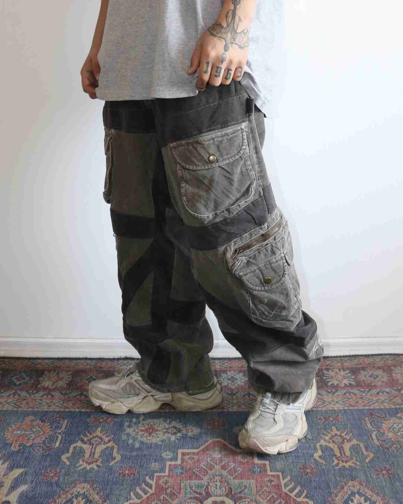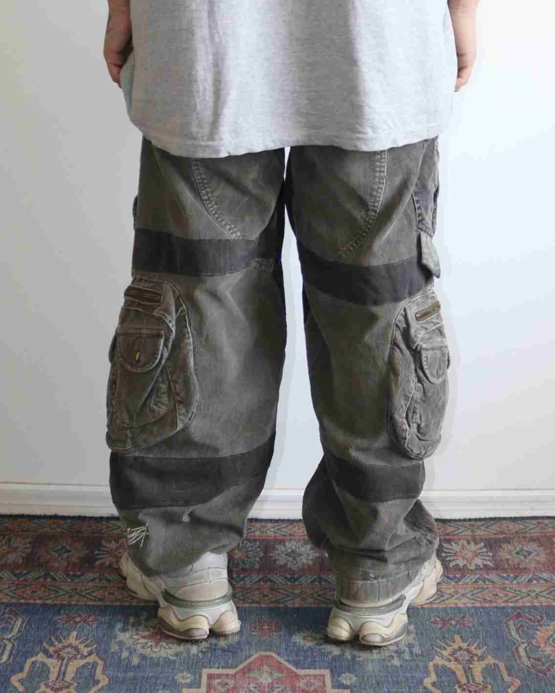 Prenda creada en base a pantalón reciclado y retazos de chaqueta cotele y detalles de camisa gruesa. Cuatro bolsillos en cada pierna a la altura de la rodilla, uno de ello posee cierre - tres bolsillos en la parte trasera - broche lateral porta llave en la pierna izquierda - bordado de color beige en cada pierna - En total posee 13 bolsillos.