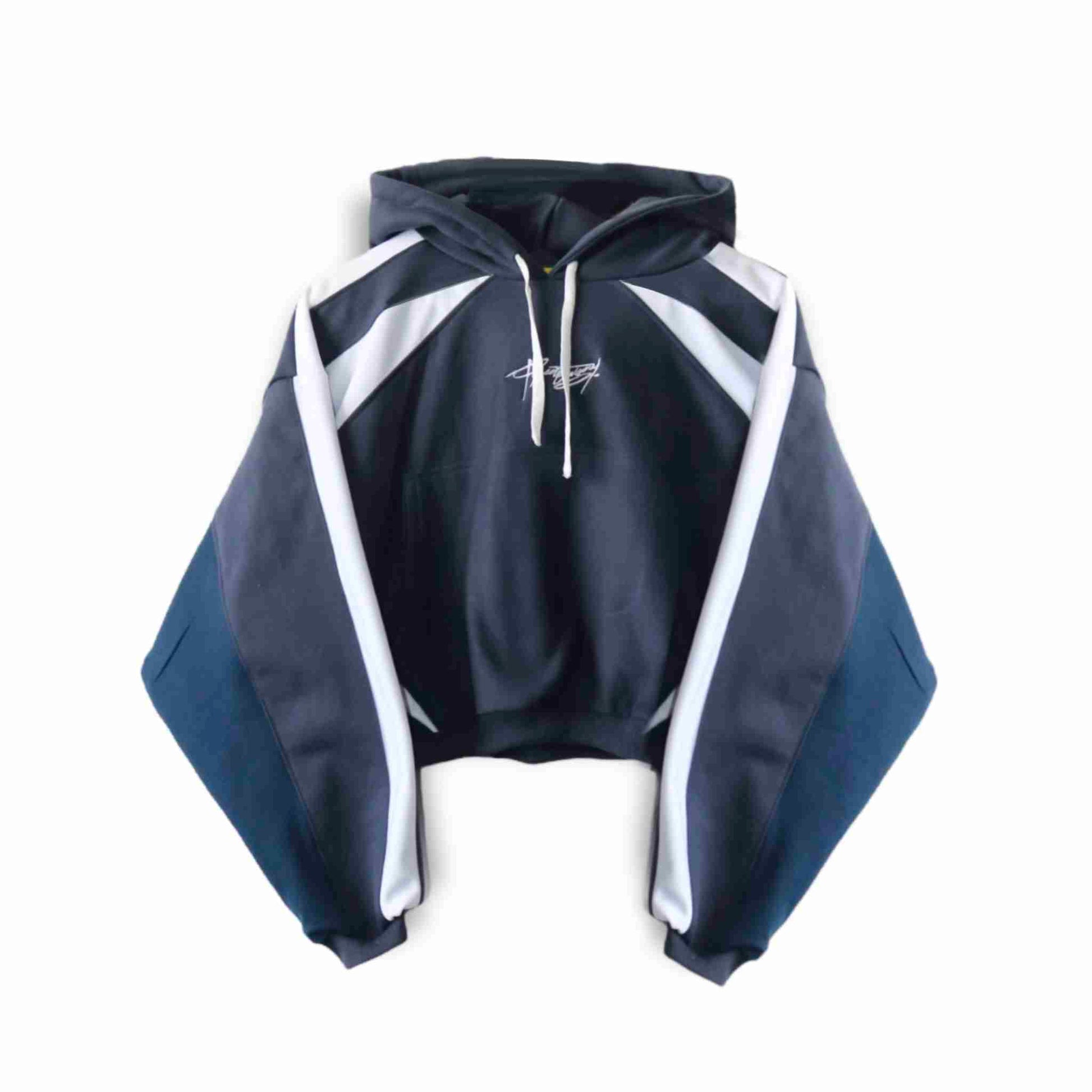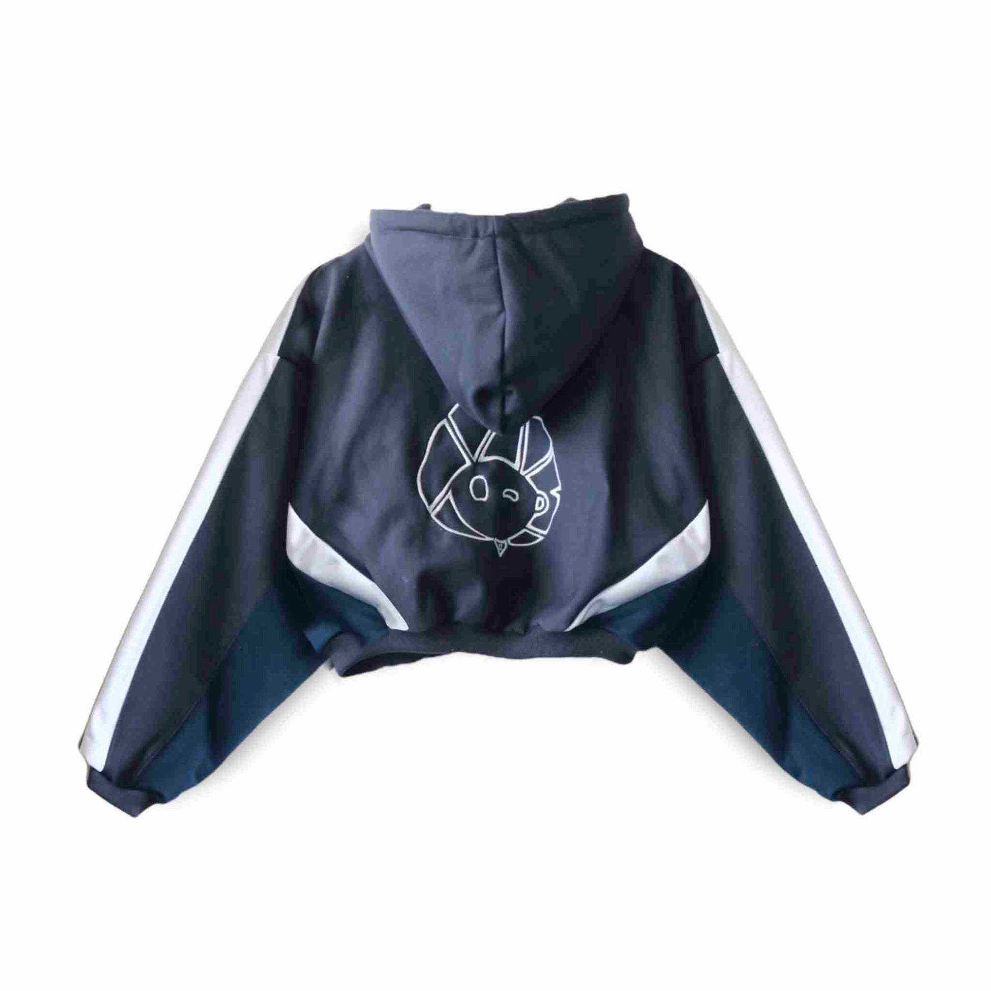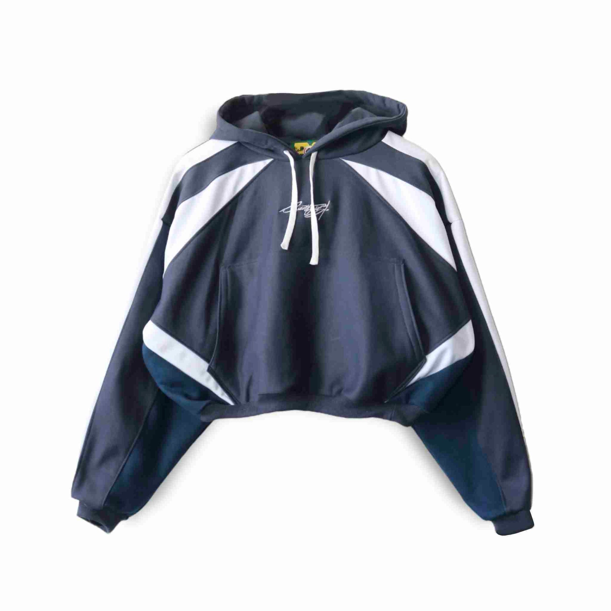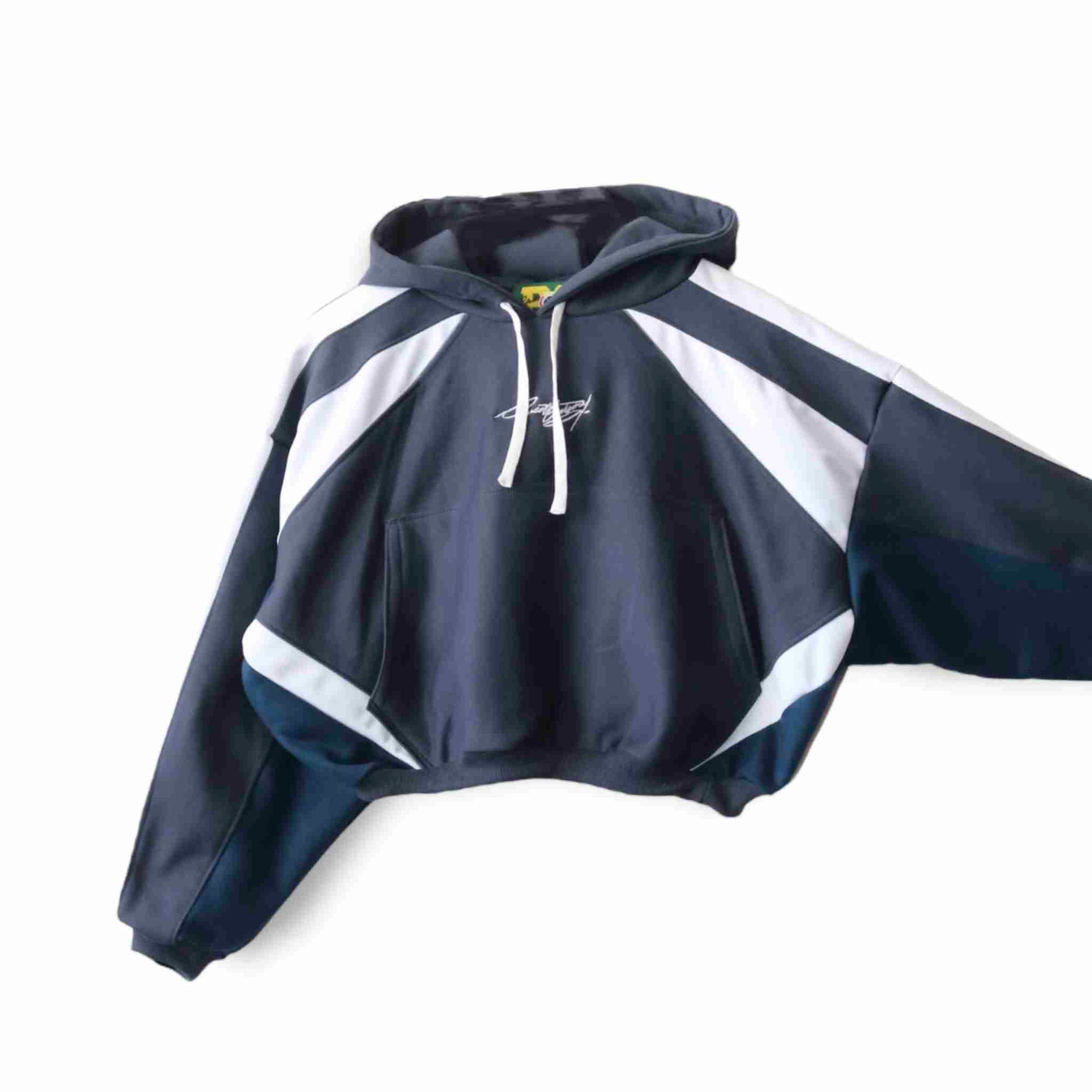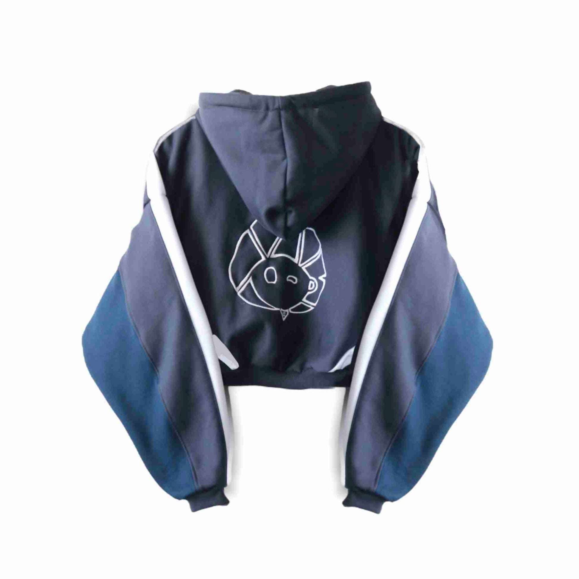 Prenda creada con tela de franela algodón y franela deportiva, posee bardado color blanco en la parte frontal y espalda. Bolsillo canguro